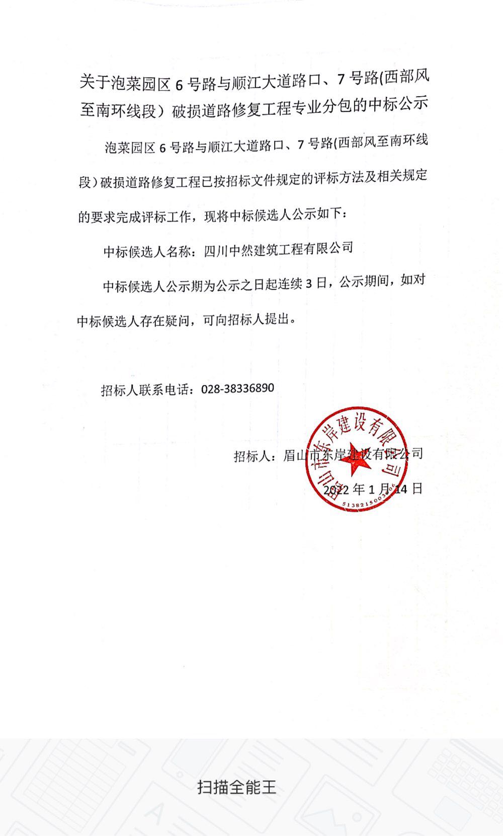 關于泡菜園區(qū)6號路與順江大道路口、7號路(西部風至南環(huán)線段)破損道路修復工程專業(yè)分包的中標公示