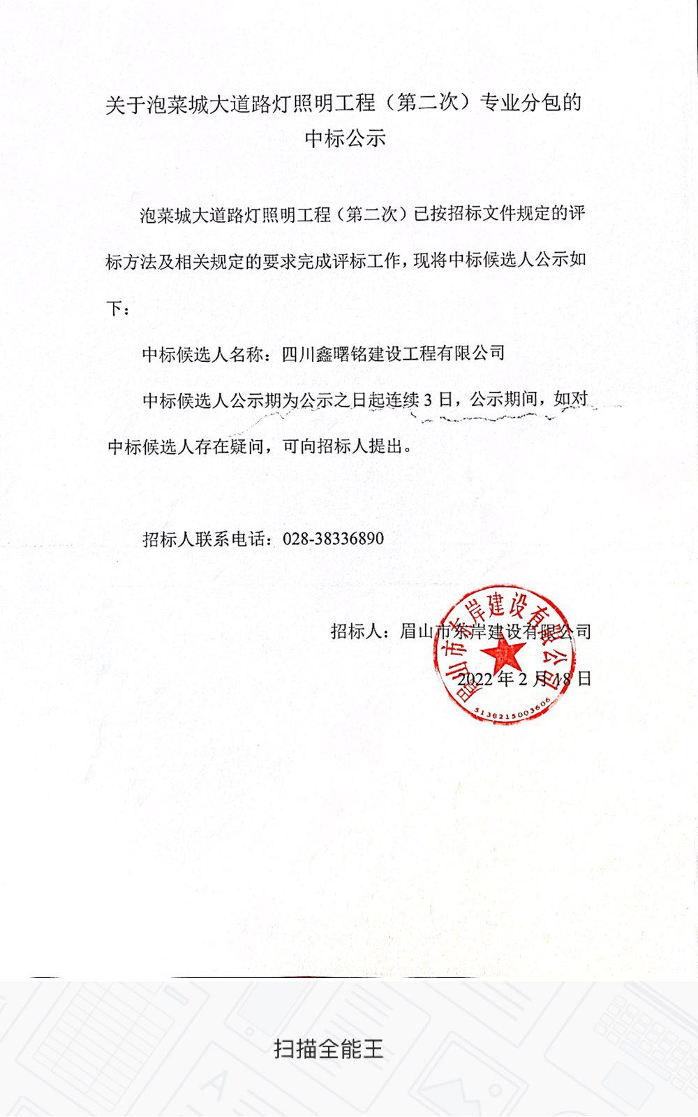 關(guān)于泡菜城大道路燈照明工程(第二次)專業(yè)分包的中標公示